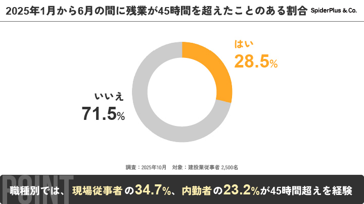2025年1月から6月の間に月の残業時間が45時間を上回ったことのある従事者は全体で28.5%、職種別では現場従事者の34.7%、内勤者の23.2%が該当し、残業時間対策は職種を問わない業界全体の課題であると考えられます。