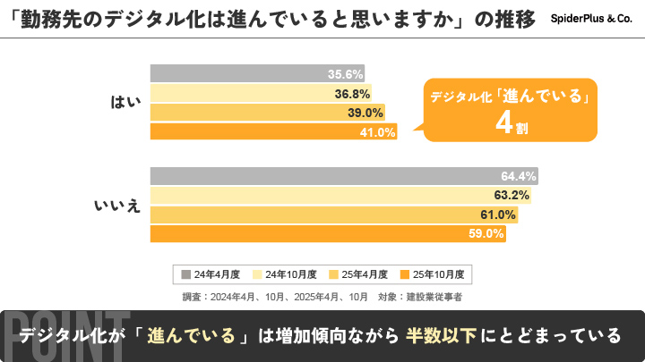 「勤務先のデジタル化は進んでいると思いますか」の問いに「はい」を選んだ従事者は2024年4月の35.6%から2025年10月には41.0%へ上昇。