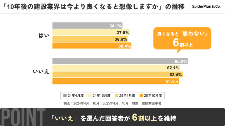 「10年後の建設業は良くなると思いますか」の問いに「はい」と選択した従事者は2024年4月の34.1%から2025年10月には38.4%に増加しています。